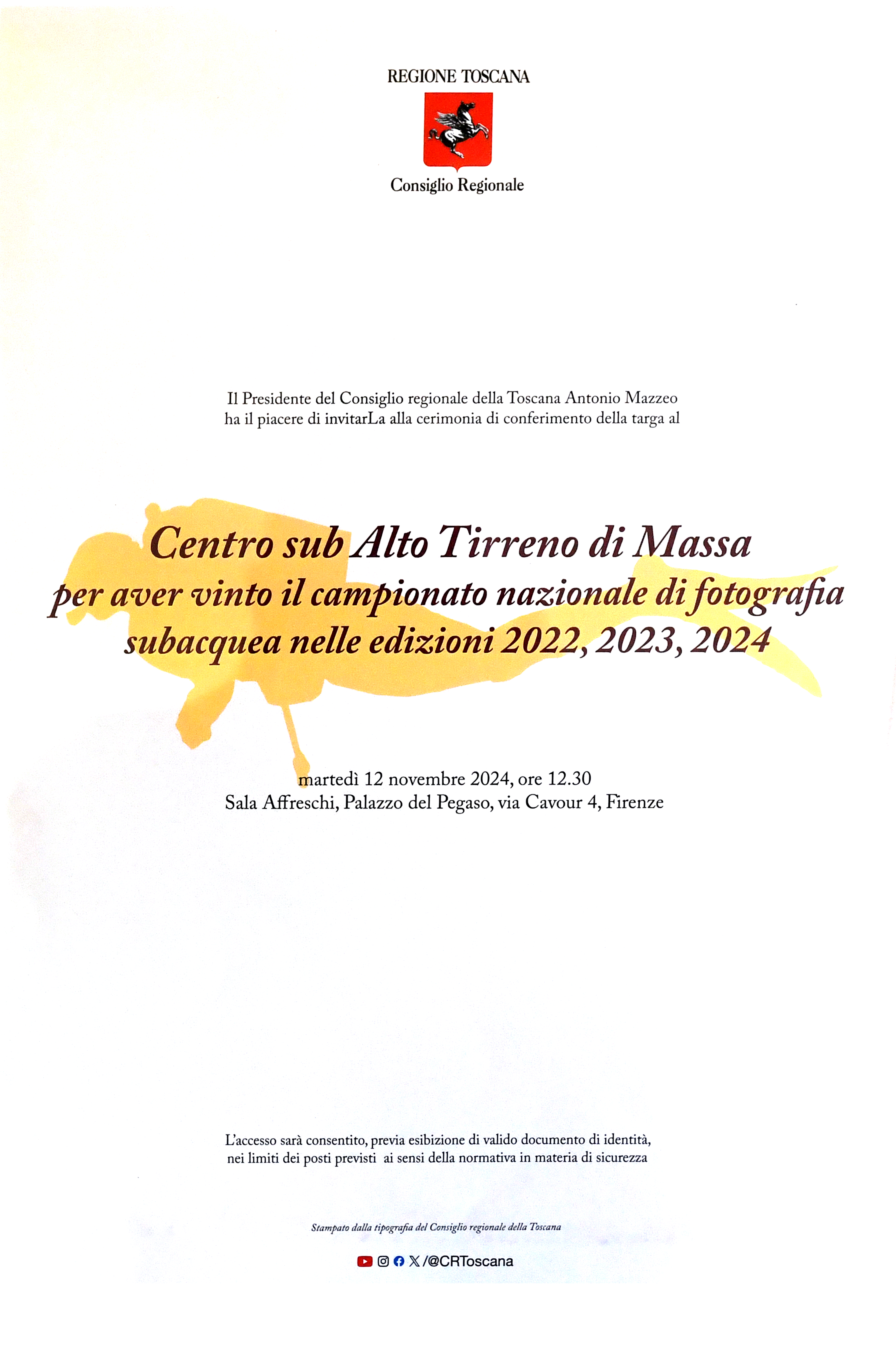 Il Centro Sub Alto Tirreno organizza il 28° Trofeo di Fotografia Subacquea, gara selettiva valida per la qualificazione al Campionato Italiano 2025. La gara si svolgerà nelle acque presso l'Isola del Tino il giorno 31 maggio 2025. Il regolamento della gara è scaricabile nella sezione dowload del sito.