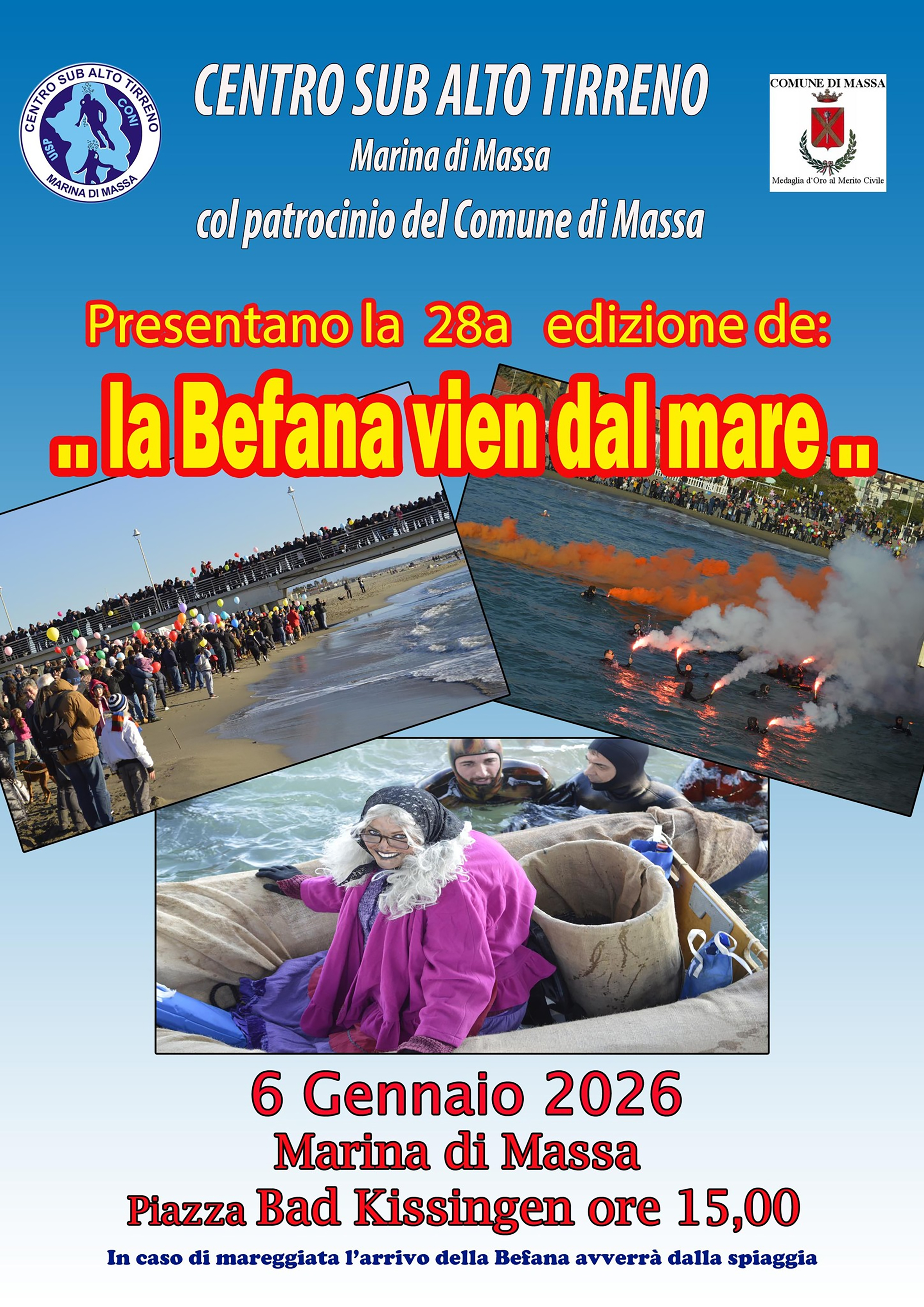 Il 6 gennaio si è svolta, cme da tradizione del Centro Sub Alto Tirreno la 27 edizione de "La Befana vien dal mare". Come ogni anno in questo giorno di festa, atteso con entusiasmo da grandi e piccini, è approdata a Marina di Massa la Befana del CSAT, accompagnata dai sommozzatori del circolo, e una volta a terra ha distrubuito a tutti i bimbi (e non solo) presenti palloncini e sacchetti con caramelle.